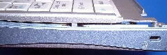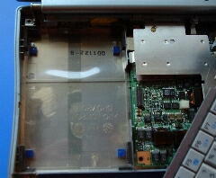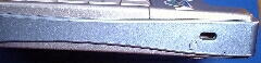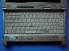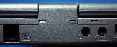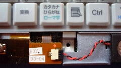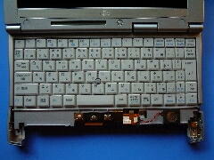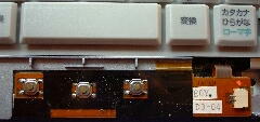 ロックは本体と液晶パネルの結合部分にあります。上図の細長い四角形が3つ並んでいる内の左の2箇所がそれです。細いマイナスドライバーでロックの下から、てこの要領で押してやれば簡単に外れます。ここでは少し外すだけでOKです。この作業は、後述のキーボード外側のパネルを取り外す直前に行ってもかまいませんが、次の作業(ポインタボタンの外側のパネルを外す)の前に行う方が安全です。 |