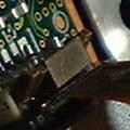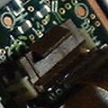 ボタン基盤を外します。まず、左端に金属棒がありこれで刺さっている状態なので左側から持ち上げるようにして外します。次にボタンの基盤のケーブルを外します。Fig. 7-1では右の方、スピーカーケーブル端子のすぐ左上に見えているのがケーブルです。爪の部分はFig. 7-2からFig. 7-3の状態に起こすことで、ケーブルを引き抜ける状態になります。 |