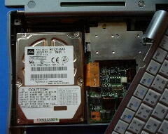 LOOX-S5のHDDは、2.5インチ、9.5mm厚ですので、このサイズに適合することと、回転数が4200rpmで容量が10GBだったので、これより高速回転で大きい容量のものを購入することにしました。また、このマシンは仕事専用マシンにしていたので、信頼性や性能を重視してHDDを選びました。この結果、日立のHTS548030M9AT00(5400rpm、30GB)をソフマップ梅田店で購入しました。店頭購入だったので12999円(税別)でした。 |