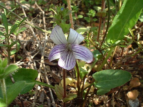 私がスミレに興味を持つきっかけとなった、ほぼ純白のアリアケスミレ。雑草の多い環境だと、葉が細くなって花の位置も高くなる様子。 |