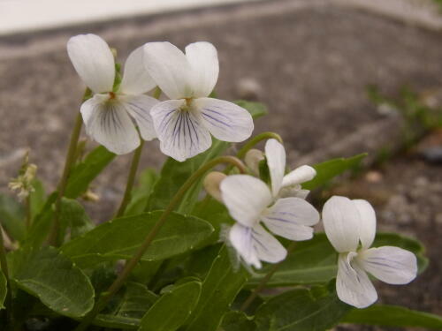 白い花弁に青紫のすじが美しいすみれでした。揃って歩道側を向いて、可憐な花を咲かせていました。 |