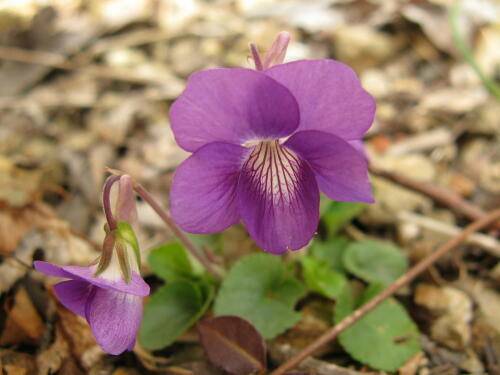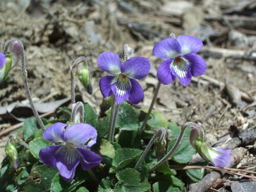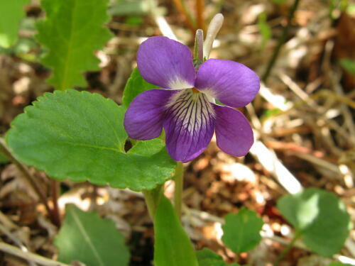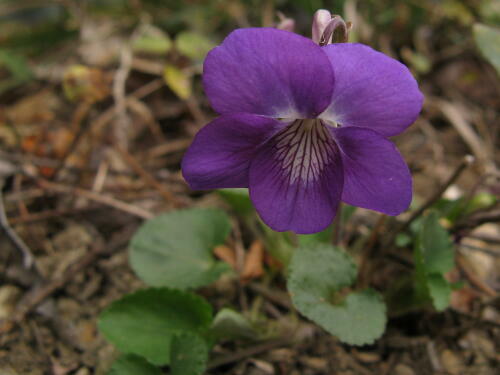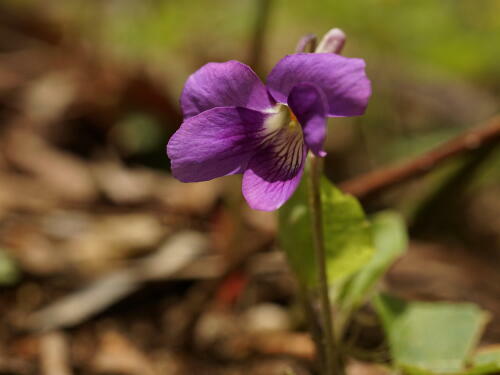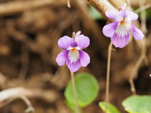 まだ枯葉が目立つ樹林の中、濃い紫色と白のコントラストがくっきり鮮やかでした。タチツボスミレに混じって咲いていました。 |