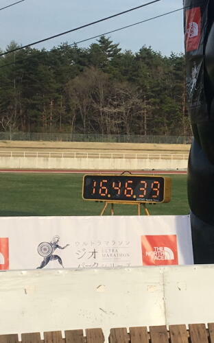 ど坂を登って行きます。もう走る元気は残っていませんでしたが、足が攣ら ない程度で精一杯早く歩きました。林に囲まれて富士山は見えなくなり、周 りの人もほとんどが歩いていました。あと少し、あと少し。98.4km、最後のエ イドで水を一口。下り坂になったので、周りのランナーが走り始めます。私も 最後の力を振り絞って走りました。