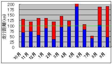 2011年10月から2012年9月までの、月間走行距離をまとめたグラフです。