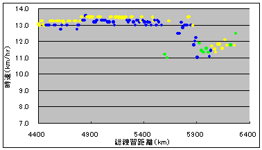 このグラフは、練習を重ねる毎に走る速度がどのくらい向上したか調べたものです。青は平地、黄色は坂道トレーニングで走った時の速度です。緑は、給水練習を兼ねた20-36km走の時の速度です。給水・休憩時間込みです。
