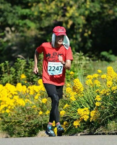 ので疲労感は無いのですが、股関節と左膝の痛みが次第に強くなってきた ため、少し歩幅を狭くして走ることにしました。股関節の痛みは何とか耐えら れる範囲で抑えられましたが、30qを越えない内に、両足のふくらはぎや太 腿が痙攣し始めました。単なる練習不足かランニングフォームの問題なの か、あるいは貧血が関係しているのかよくわかりませんが、ここ3回のウルト ラマラソンでは毎回、30-40qで痙攣し始めます。だから、これもまた想定の 範囲内。無視して前進あるのみです。