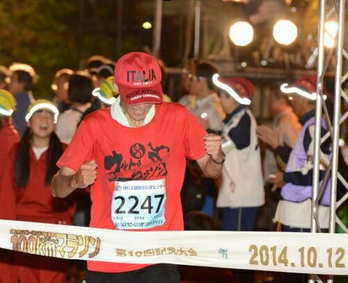 きないかもしれない。私は"走る"ことを断念しました。ひたすら、速足。休憩 も無しで、とにかく速足。足の付け根から足の裏まで、いつもどこかがピクピ ク攣っている状態で、痛みをこらえて速足。最後の給水所を過ぎるともうか なり暗くて、足元がよく見えませんでした。何かにつまずいて転べば、さっき の痙攣が起こるかもしれない。痛みと不安でいっぱいの中、沿道で応援して くれる皆さんの「お帰り! もう少しだよ!」との声に、どれだけ勇気づけら れたことでしょう。ユートピアくびき希望館の中へと続く道に入り、レッドカー ペットが見えた瞬間、初めて完走を確信しました。ちょうどランナーが途切れ て私一人だったため、左右にずらりと並んだ人たちと、ありがとうの連呼で ハイタッチ。18:45、フィニッシュゲートに張られた白いテープを切りました。 ![]()