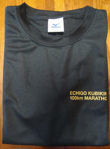 の写真は、参加賞の半袖Tシャツ。完走メダル(右下の写真)は越後杉の板 に金色の金属プレートがはめ込んでありました。裏面には「義のこころ 謙 信公の地 いざ出陣」と書かれています。 ![]()