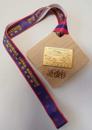 いたのと合わせると、40q以上は歩いたことになります。それでも完走でき たのは、沿道の皆さんの温かい声援、エイドの皆さんの心のこもったおもて なしがあったからだと思います。ありがとうございました。前日夕食の弁当を 含め体調管理をしてくれた妻、受験生にもかかわらず毎晩マッサージをして くれた娘(今度こそ合格しろよ)に、感謝。仕事中に甘いものを食べ過ぎない よう見張ってくれたIさん、走行プランをラミネートしてくれたMさん、たくさん の助言をくれたウルトラランナーOさんなど会社の同僚にも感謝です。そし て、公私ともに大変お世話になっており、今回も早朝から応援に来てくださ った上越市在住のtkdさんにSpecial Thanks!です。