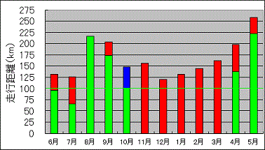 2014年6月から2015年5月までの、月間走行距離をまとめたグラフです。