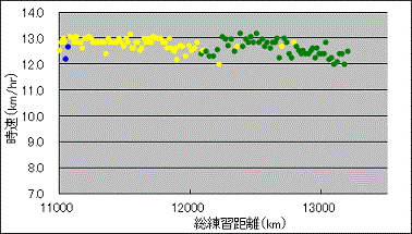 このグラフは、練習を重ねる毎に走る速度がどのくらい向上したか調べたものです。青は平地、黄色は坂道トレーニングで走った時の速度です。緑は、給水練習を兼ねた18-30km走の時の速度です。給水・休憩時間は含みません。