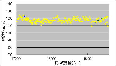 このグラフは、練習を重ねる毎に走る速度がどのくらい向上したか調べたものです。黄色は坂道トレーニングで走った時の速度です。緑は、給水練習を兼ねた18-24km走の時の速度です。給水・休憩時間は含みません。