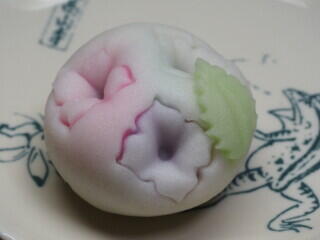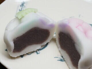 白餡を薄く赤と青で染め薄緑の葉で紫陽花を模した練り切り。中はこし餡。甘い。 |