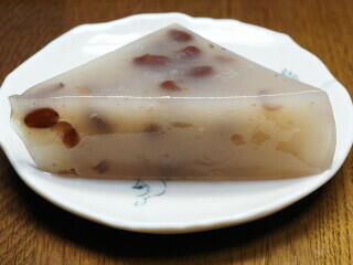 黒糖味の蕨餅と寒天で作られた水無月。小豆は中に入る。やや甘い。 |