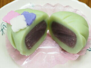 薄緑の紫陽花の葉に赤青白の花びらを乗せた練り切り。中はこし餡。甘い。 |