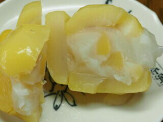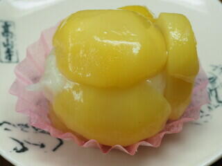 瓶詰めの栗の甘露煮を食べているような菓子。中の求肥にも栗片。極甘い。 |