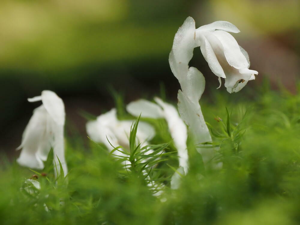 昼間でも薄暗い森の中、白く透き通るような姿が印象的です。