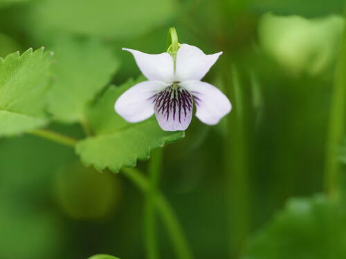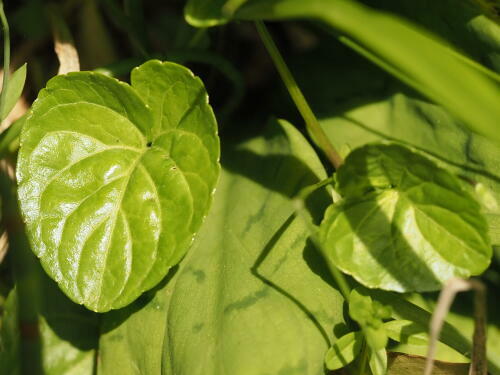 花期を終えた株の葉を撮影。ミヤマツボスミレに特徴的な丸くて先の尖らない葉です。 |