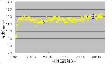 このグラフは、練習を重ねる毎に走る速度がどのくらい向上したか調べたものです。黄色は坂道トレーニングで走った時の速度です。青は平坦なコースでの練習記録。