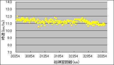 このグラフは、練習を重ねる毎に走る速度がどのくらい向上したか調べたものです。うーん、この1年間だけ見ても右肩下がりですね。練習方法を見直すべきなのかもしれません。 |