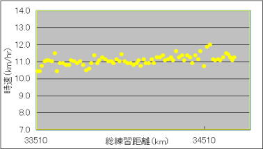 このグラフは、練習を重ねる毎に走る速度がどのくらい向上したか調べたものです。半年前の四万十川ウルトラマラソン以降は、若干ですが向上傾向のように見えますが、10月の四万十川ウルトラマラソン完走後、そのダメージで一時的にダウンしたのが回復したとみるのが正しいように思います。 |